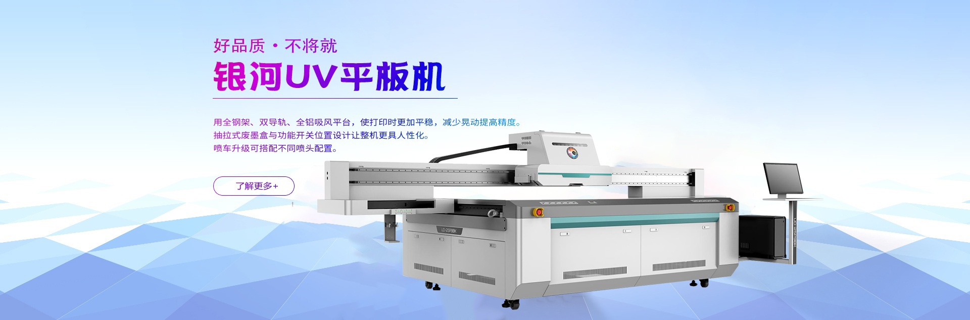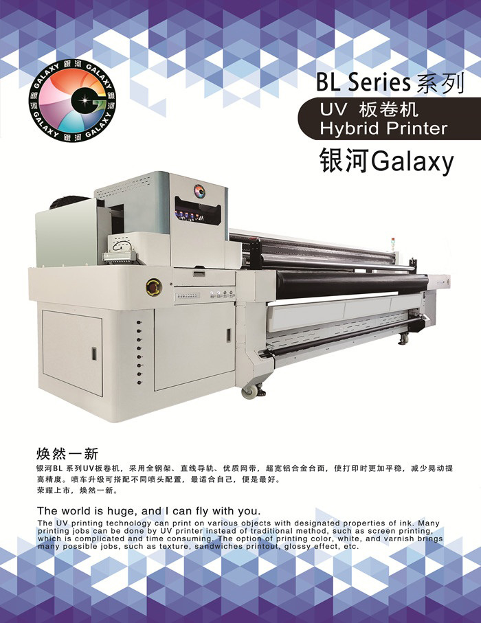 銀河BL系列UV板卷機(jī),采用全鋼架、直線導(dǎo)軌、優(yōu)質(zhì)網(wǎng)帶,超寬鋁合金臺(tái)面,使打印時(shí)更加平穩(wěn),減少晃動(dòng)提 高精度。噴車(chē)升級(jí)可搭配不同噴頭配置,最適合自己,便是最好。 榮耀上市,煥然一新。